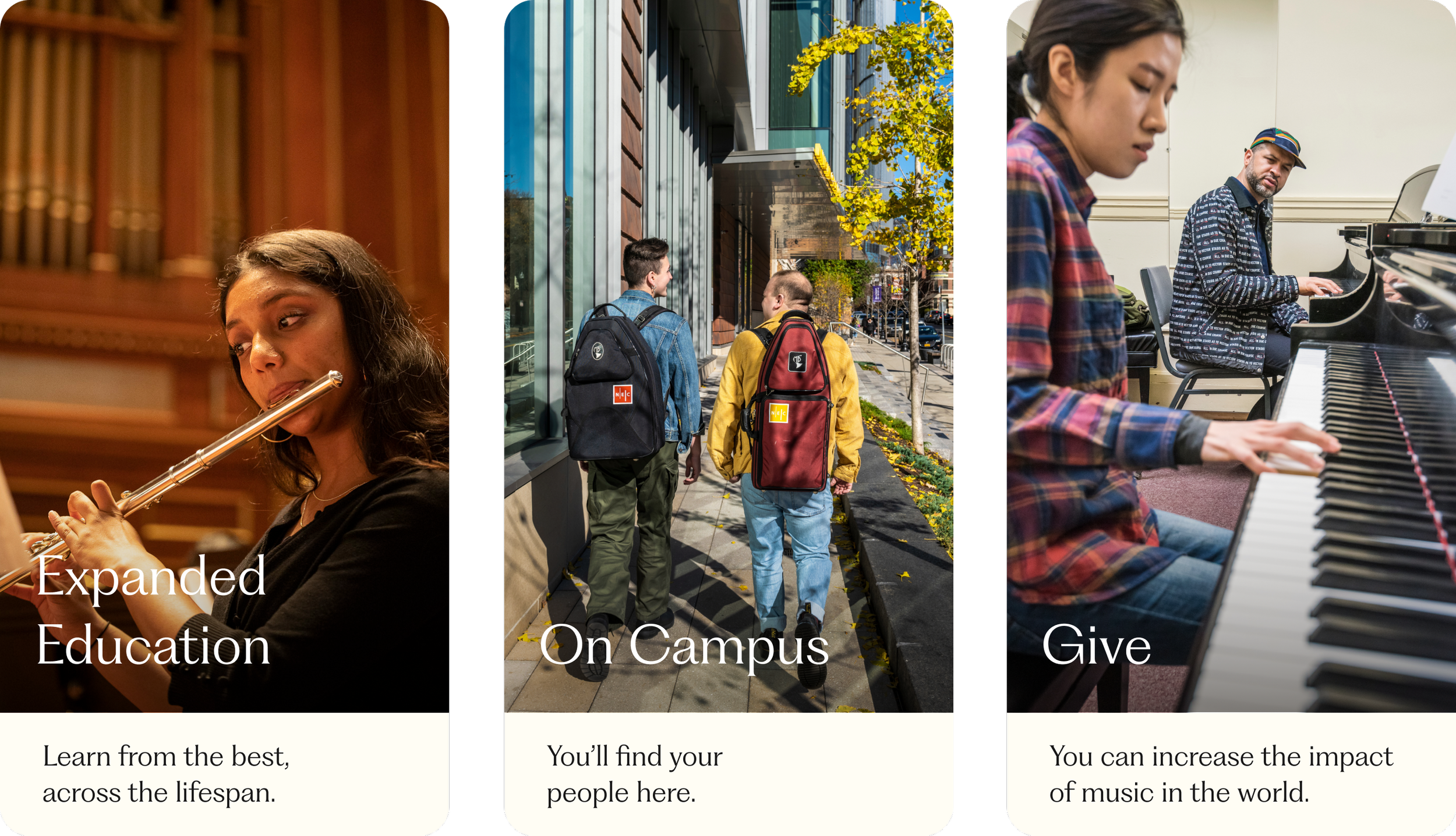 The New England Conservatory of Music (NEC) has been an incubator for musical excellence since 1867. Through constant reinvention, NEC is dedicated to educating an emerging generation of musicians who will immensely impact our world through their artistry, perspectives, and passion. To channel NEC’s evolution, we introduced a fresh color palette inspired by the sights and atmosphere of their iconic Boston campus, an elegant and modern typeface, and beautiful photography that emphasizes the educational process.